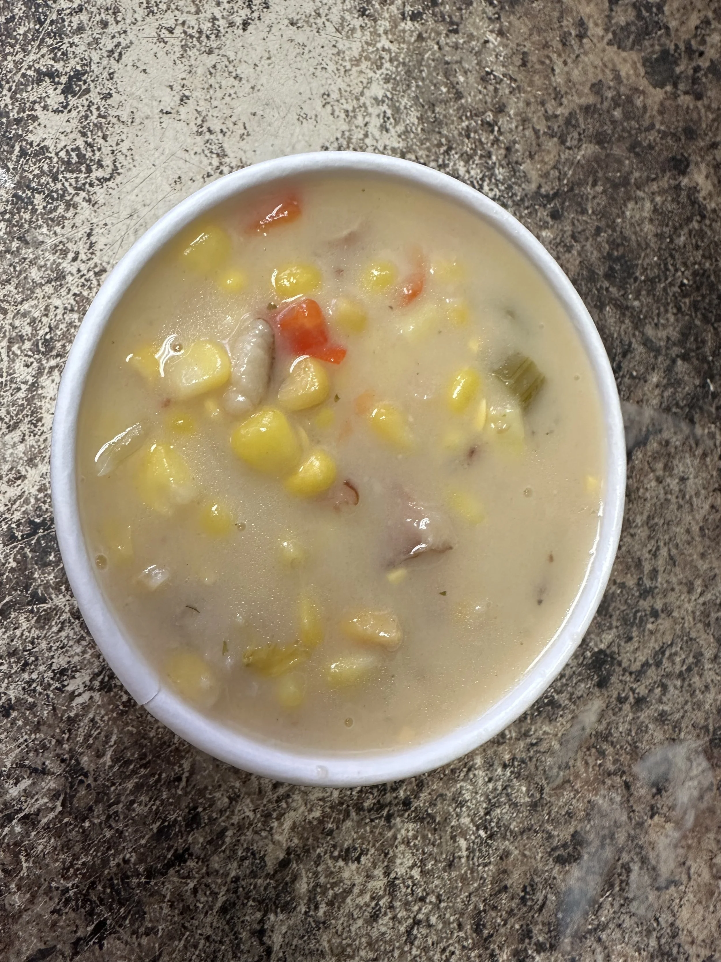 Corn, thick cut bacon, bell pepper, onion, celery in creamy chicken soup
